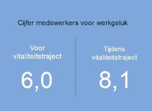 Vitaliteit begint vaak vanuit de gedachte van een hogere return of investment (ROI) of een lager verzuim. Toch halen organisaties de meeste voldoening niet uit het verlagen van de verzuimcijfers of het verhogen van de ROI, maar uit het werkgeluk en de bevlogenheid van medewerkers. Medewerkers die werken in een bedrijf waar geïnvesteerd wordt in vitaliteit becijferen hun werkgeluk met een 8,1. Dit is gemiddeld 35% hoger dan op een moment dat er geen vitaliteitstraject was. Zij ervaren bovendien: